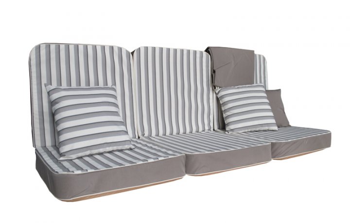 Данный сменный комплект предназначен для садовых качелей, предназначен такой комплект для сидения размером 170 см. Размер крыши составляет 200 на 118 см. В комплекте находится матрас, тент, а также четыре подушки. Крыша, матрас, а также валики в этой модели изготавливались из инновационной ткани тексилк. Данная ткань не выгорает на солнце, на ней не появляется плесень, она защищает от ультрафиолетовых лучей. В качестве наполнителя используется поролон, на матрасе есть молния. При необходимости наполнитель, а также чехол стирается.